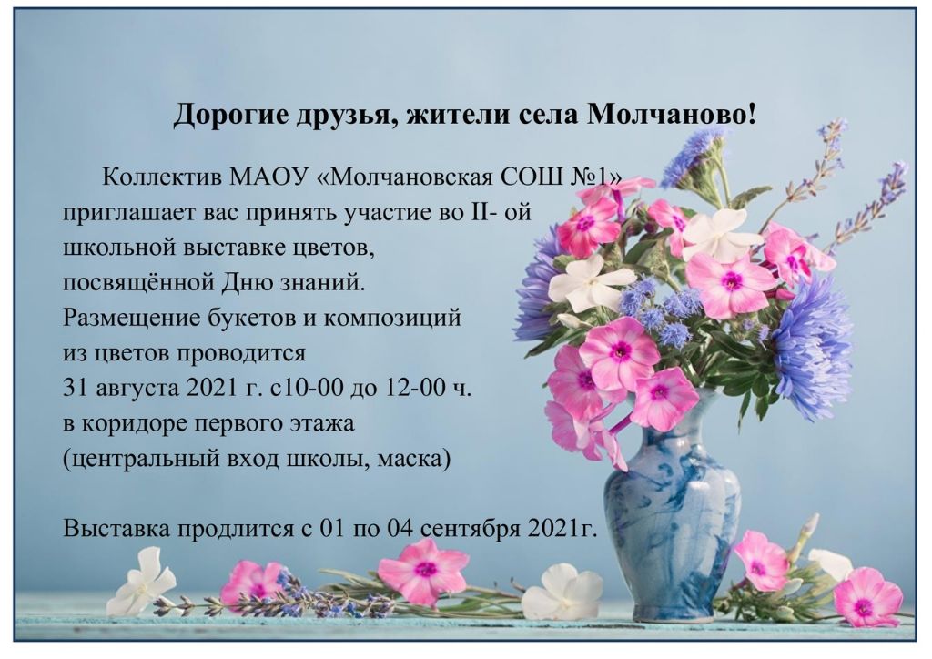 2-ая школьная выставка цветов От mlschool1 Опубликовано 30.08.2021 Без рубрики Приглашаем поучаствовать во 2-ой школьной выставке цветов, которая состоится 31 августа.