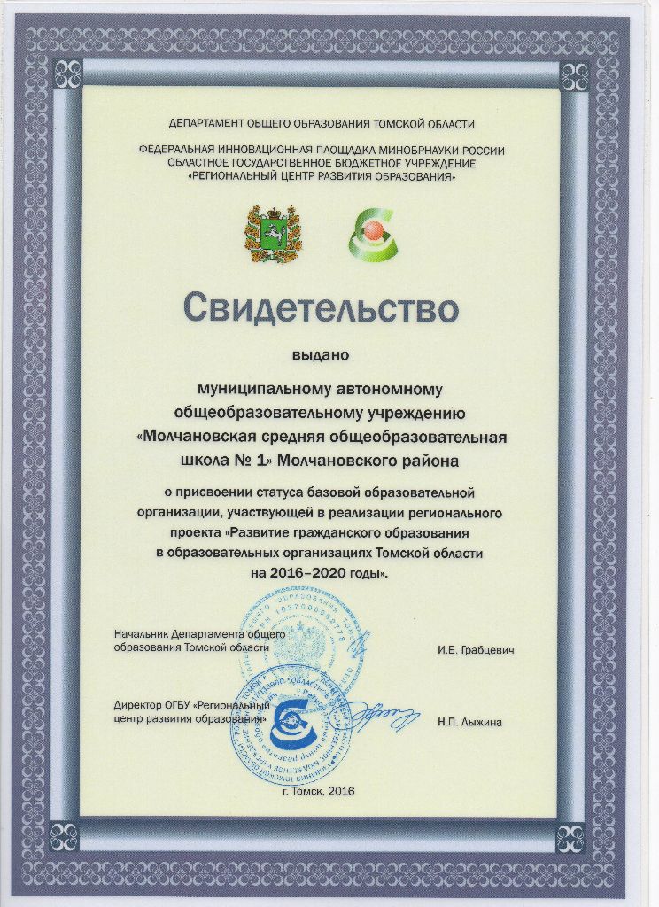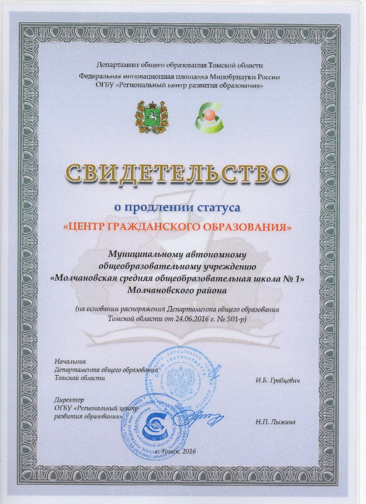 Свидетельство о присвоении статуса Свидетельство о продлении статуса Положение о Центре гражданского образования «Я, мои права и обязанности« |