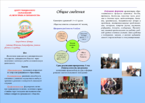 История создания В законе «Об образовании» придается большое значение развитию творческих способностей детей, государственной политике, правовому регулированию. Важным условием этого является создание механизма раскрытия способностей ученика и воспитания человека, живущего в конкретном мире, у которого воспитана порядочность и патриотизм, умение найти свое место в жизни, умение ориентироваться в своих правах и своих обязанностях. Поэтому в нашей школе был создан Центр гражданского образования: «Я, мои права и обязанности», работа которого направлена на воспитание правовой культуры и формирование законопослушного поведения школьников, а также на развитие способностей, связанных с умением осуществлять выбор и принимать решения в конкретной социальной ситуации. Изначально руководителем Центра была Федорова Светлана Михайловна, учитель истории. Под ее руководством проводились различные мероприятия, например, муниципальные игры: «Виват, Россия» и «Я – Гражданин России». С 2014 года руководителем стала Толкачева Татьяна Александровна, учитель технологии и предпринимательства, а с сентября 2019 года — Савченко Татьяна Александровна.. Слоган нашего Центра звучит так: «Учись жить с непохожими на тебя людьми», который очень точно раскрывает всю программу Центра, так как мы живем в мире, где люди не похожи друг на друга, одни злые и жадные, другие добрые и отзывчивые. Существует множество разных жизненных ситуаций: и гонения, и ссоры, и разногласия в классе, и конфликты со взрослыми, и правовые конфликты. Эмблема центра передает следующий смысл: мы разные, но мы вместе. Центр гражданского образования учит детей находиться в обществе, уметь ориентироваться в разных ситуациях. Категория слушателей Центра – 1 – 11 классы. Общая численность составляет 447 человек. Создана активная группа из учеников 5 – 11 классов, которые уже знакомы с правами и обязанностями человека из курса обществознания. Они вместе с руководителем проводят школьные мероприятия, деловые и правовые игры, классные часы по темам программы, консультируют младших слушателей, участвуют в различных конкурсах. Работа Центра набирает все новые и новые обороты.
