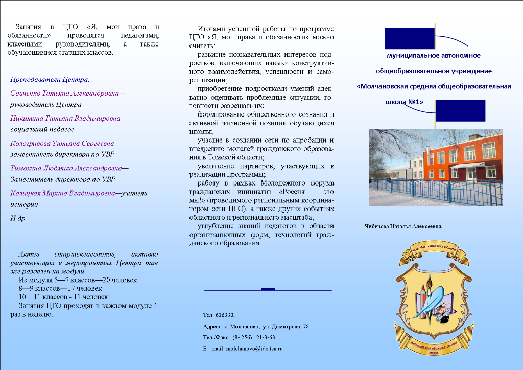 Социальные партнеры (Региональный центр развития образования) Контакты: Руководитель центра — Горемыко Екатерина Сергеевна Адрес: 636330 Томская область, село Молчаново, ул. Димитрова, 78 Телефон/факс: (838256) 21365 (учебная часть) e-mail: molchanovo@ido.tsu.ru |
